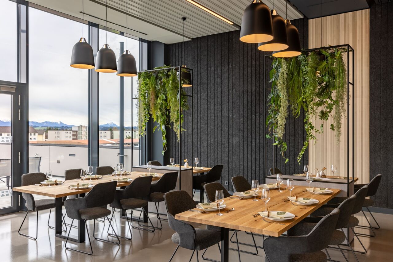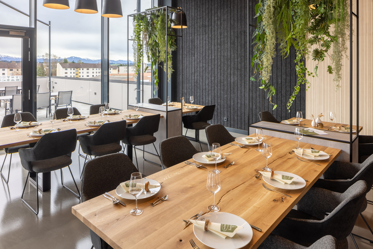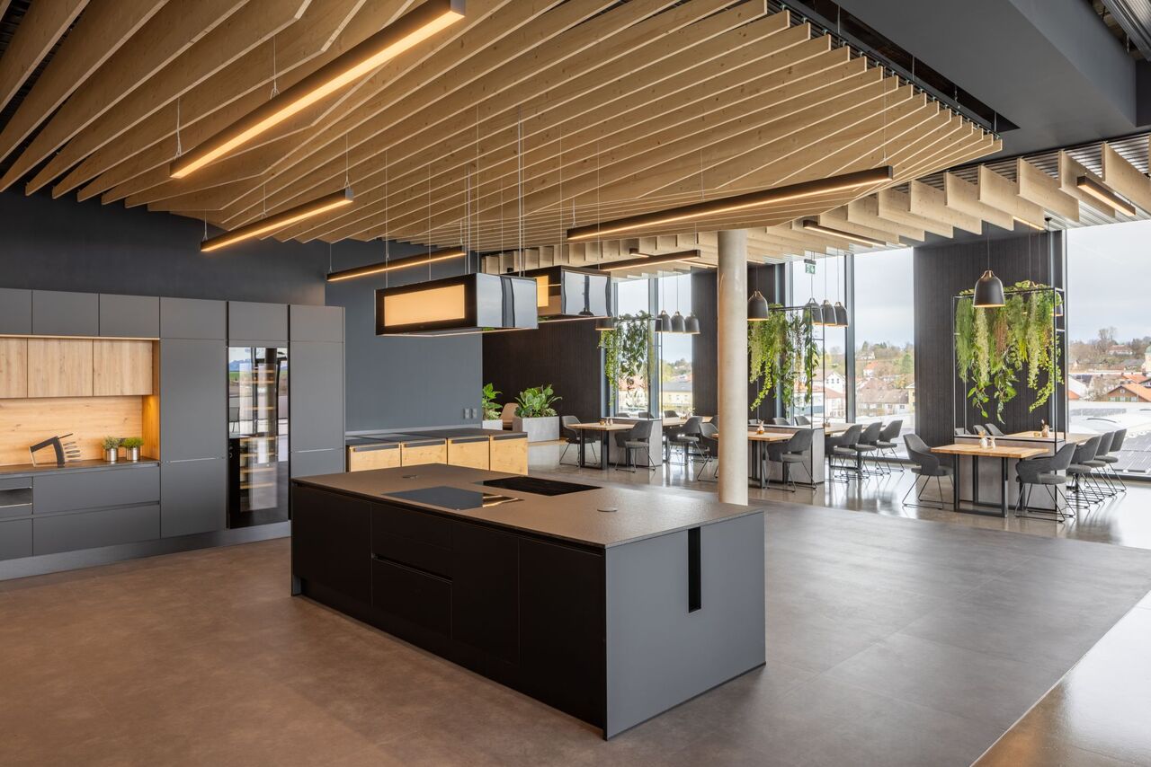 Industrielle Ästhethik und zeigemäßes Design. Im dritten Obergeschoss des 2024 eröffneten Kopfbaues der Firma Rösle entwickelten wir das Konzept und die Umsetzung für eine Grill und Kochschule. Durch geschickte Gestaltung ohne den Einsatz von Wänden wird eine offene und einladende Atmosphäre geschaffen, die durch die Verwendung unterschiedliches Materialien und Strukturen verstärkt wird.