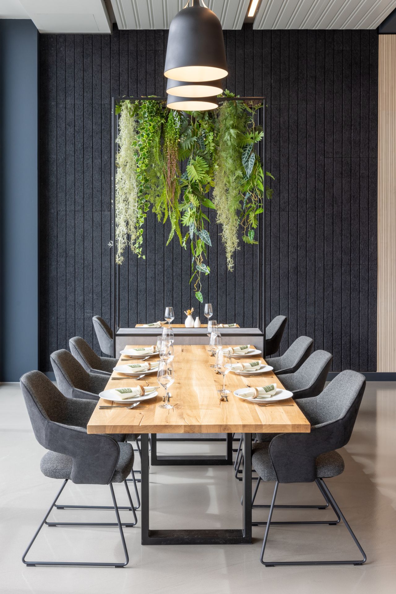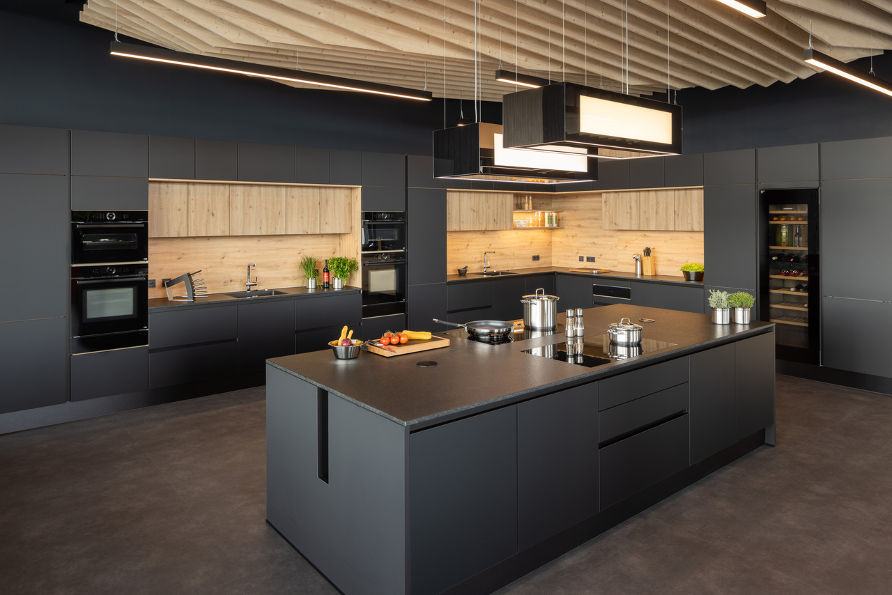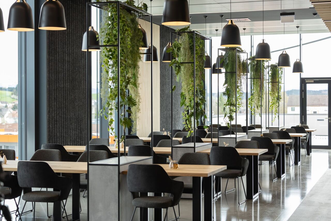 Industrielle Ästhethik und zeigemäßes Design. Im dritten Obergeschoss des 2024 eröffneten Kopfbaues der Firma Rösle entwickelten wir das Konzept und die Umsetzung für eine Grill und Kochschule. Durch geschickte Gestaltung ohne den Einsatz von Wänden wird eine offene und einladende Atmosphäre geschaffen, die durch die Verwendung unterschiedliches Materialien und Strukturen verstärkt wird.